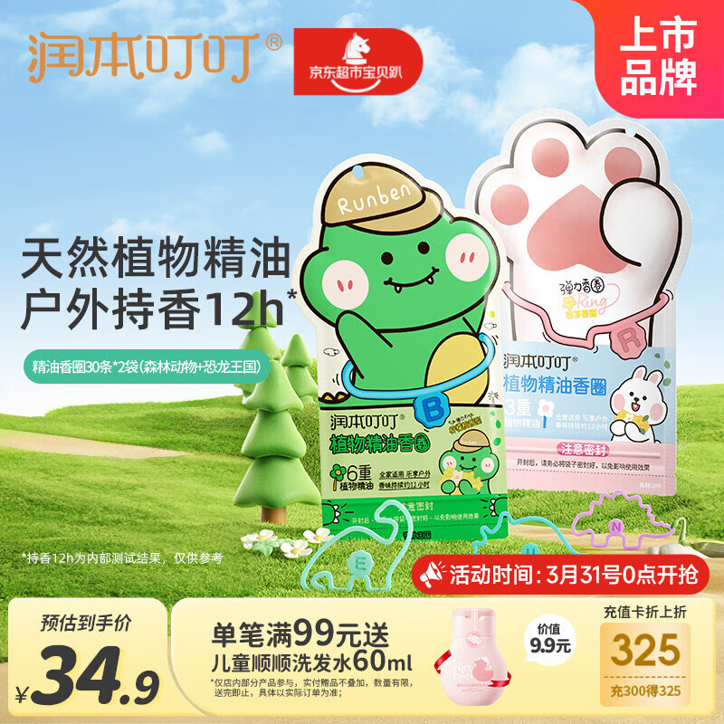 润本儿童叮叮植物精油手环30条*2户外儿童防护香圈森林动物+恐龙王国