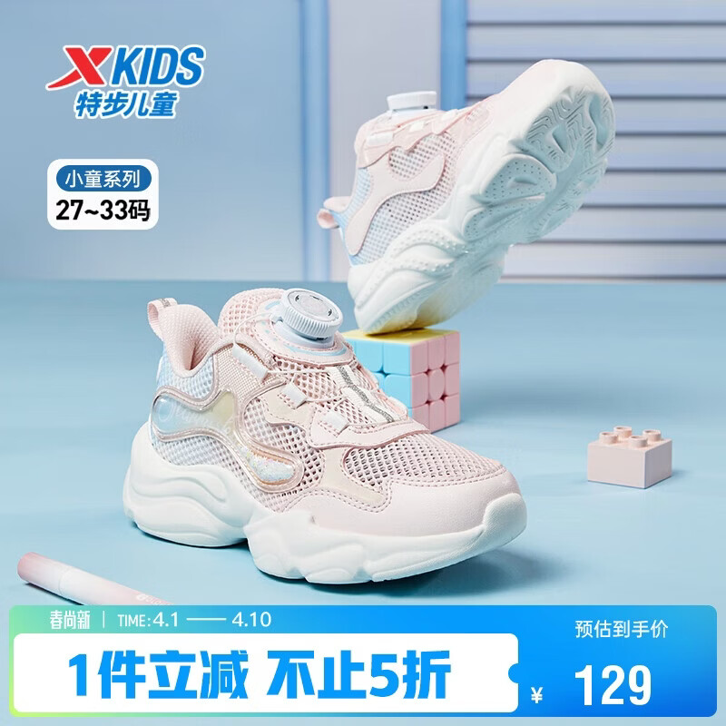 特步(XTEP)儿童童鞋女童小童透气网革旋转扣休闲鞋 水粉色/微波蓝 33