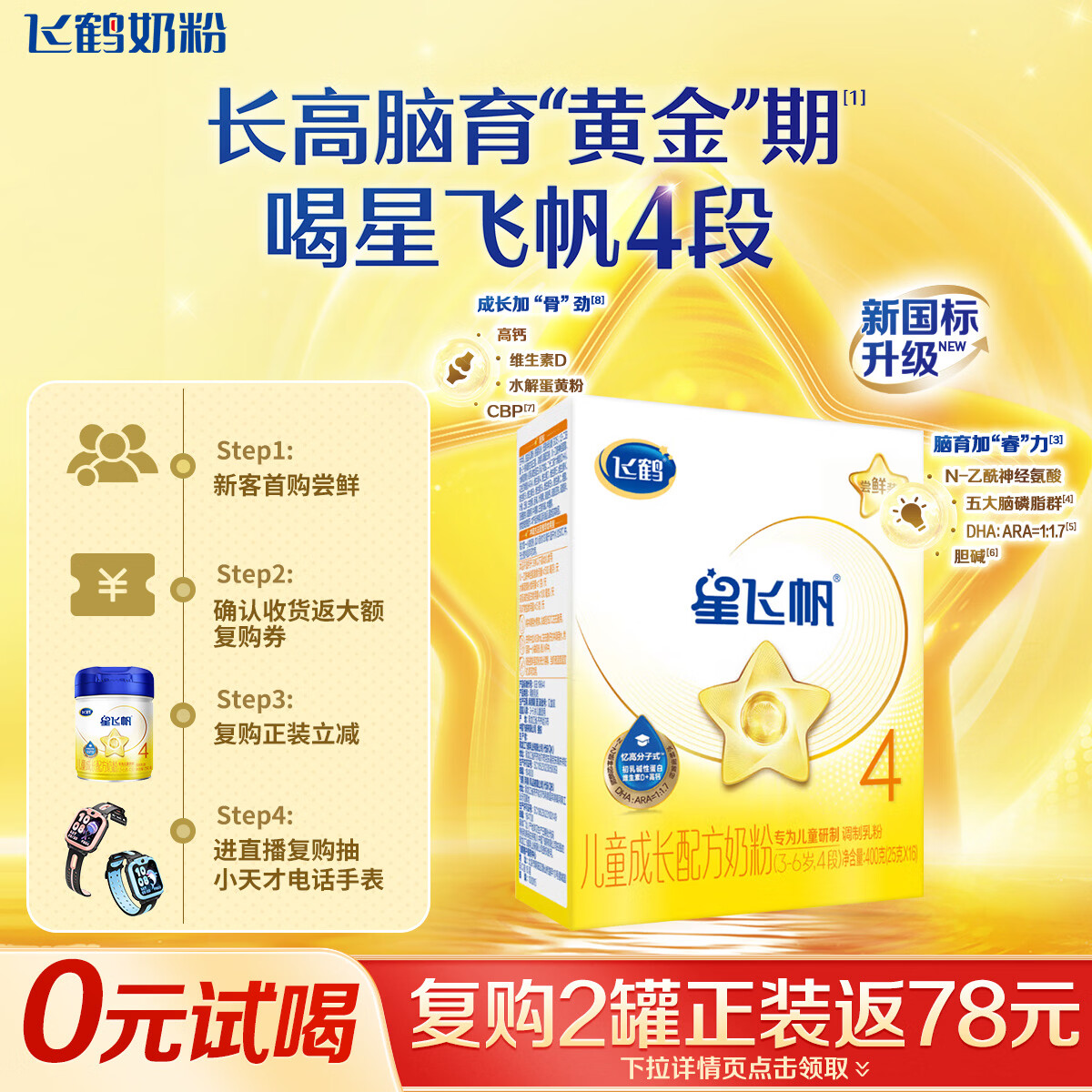 飞鹤星飞帆 CBP骨骼发育一米八八儿童奶粉4段(3-6岁) 400g 京东试用