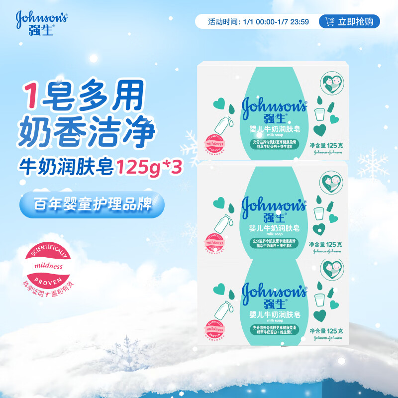强生(Johnson)婴儿牛奶润肤皂125g*3 宝宝儿童洗澡沐浴洗手洗内衣尿布香皂洁净