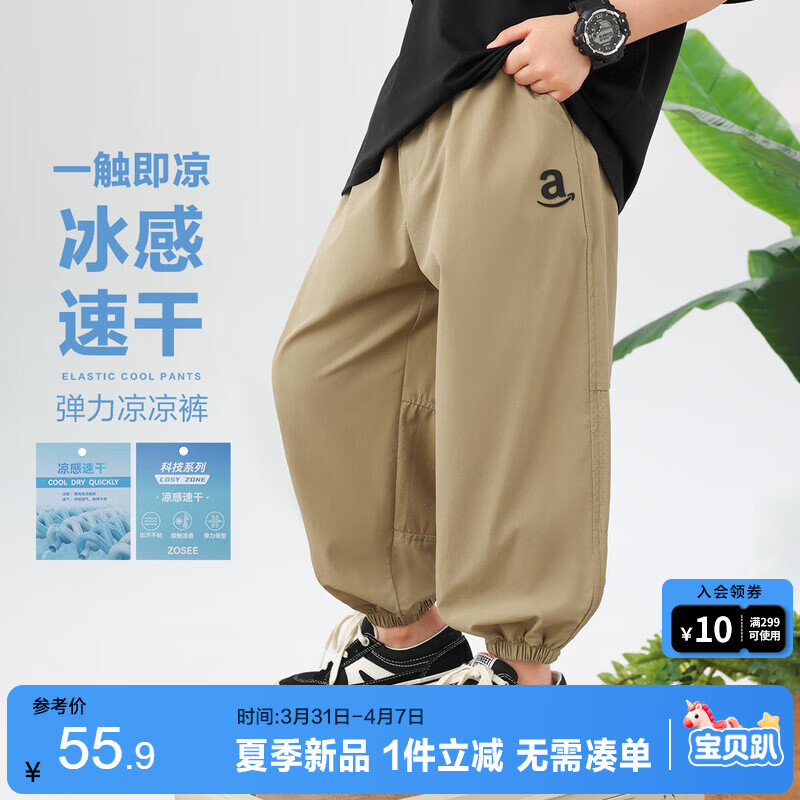 左西男中大童防蚊裤2026夏季男孩凉感速干薄裤子儿童长裤 卡其色 140