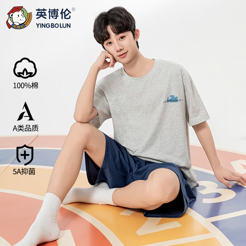 英博伦男大童夏季睡衣薄款青少年学生短袖男童家居服套装 20817 麻灰165