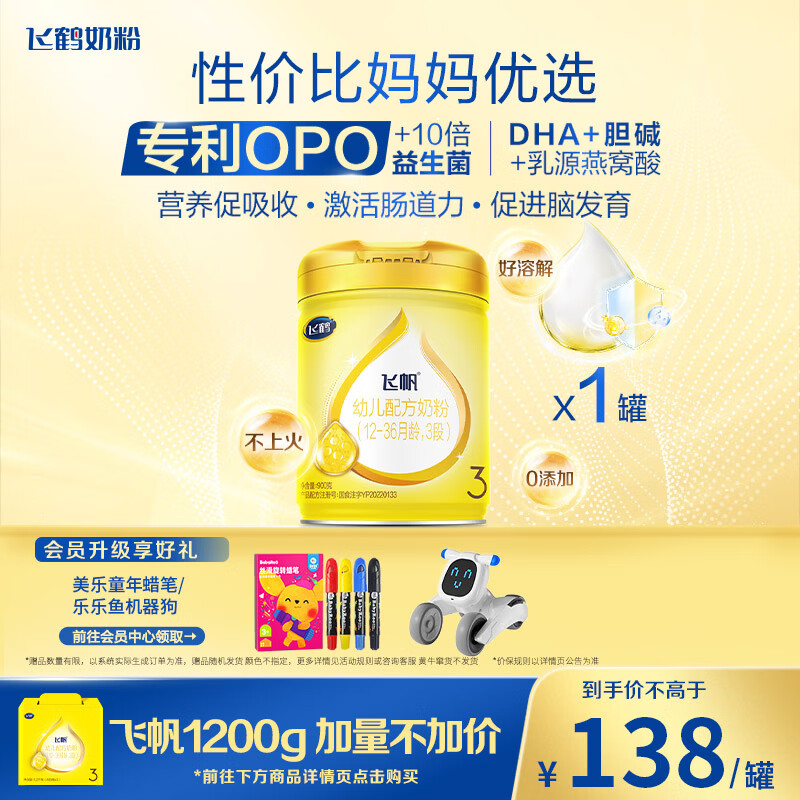 飞鹤飞帆OPO促吸收幼儿配方奶粉3段(12-36月龄)900克DHA好脑力