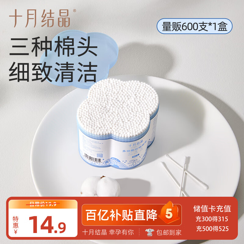 十月结晶婴儿棉签 清洁耳鼻宝宝专用棉棒细轴三种棉头 600支*1盒