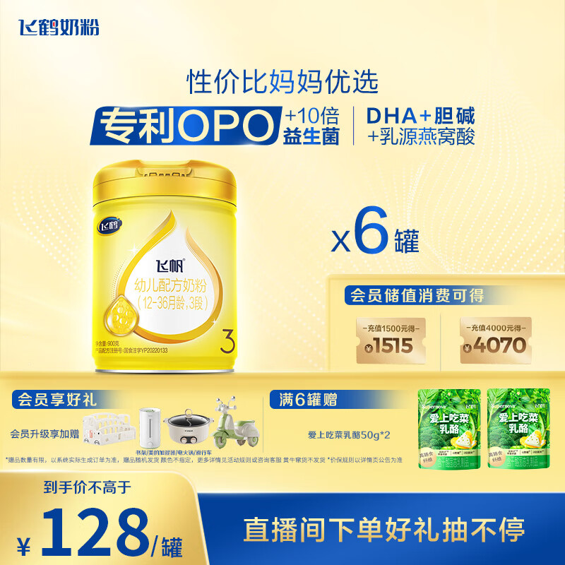 飞鹤飞帆OPO促吸收幼儿配方奶粉3段(12-36月龄)900g*6 DHA好脑力