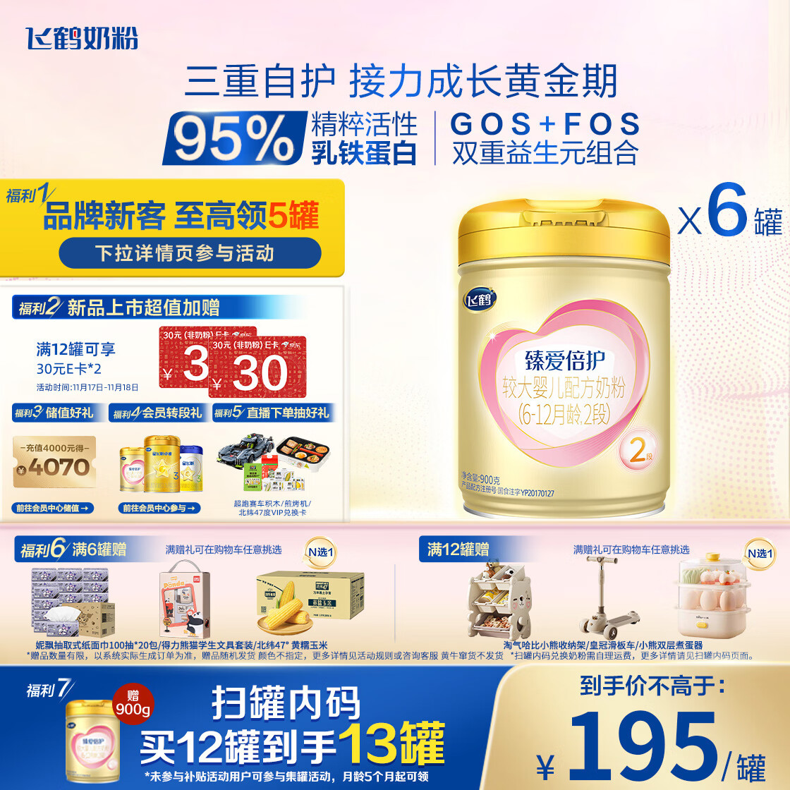 飞鹤臻爱倍护 婴儿配方奶粉2段(6-12个月) 900g*6 乳铁蛋白 育儿补贴