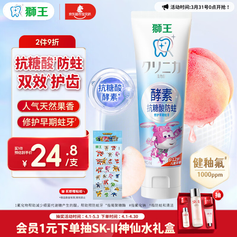 狮王(lion)齿力佳酵素抗糖防酸蛀儿童牙膏含氟6-12岁蜜桃味60g
