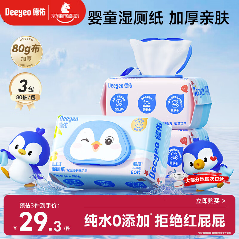 德佑婴童纯水湿厕纸80抽3包 洁厕湿纸巾擦屁屁专用 母婴级0敏可冲马桶