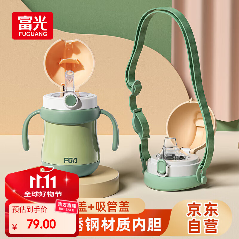 FGA富光儿童保温杯宝宝吸管杯鸭嘴学饮杯316L不锈钢喝水壶水杯子绿色