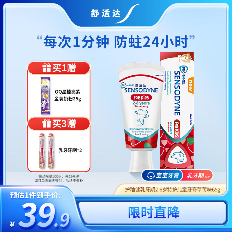 舒适达护釉健儿童牙膏2-6岁防蛀含氟 65g草莓味 护龈固齿 热门商品