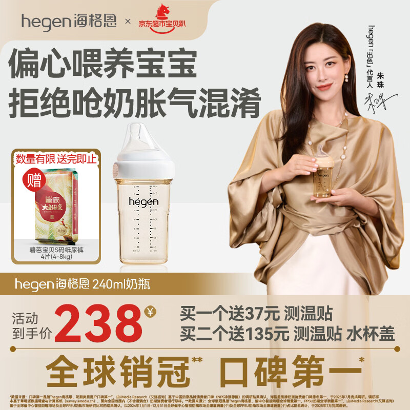 HEGEN海格恩奶瓶PPSU防胀气防呛仿母乳原装进口白色240ml新生儿3-6个月