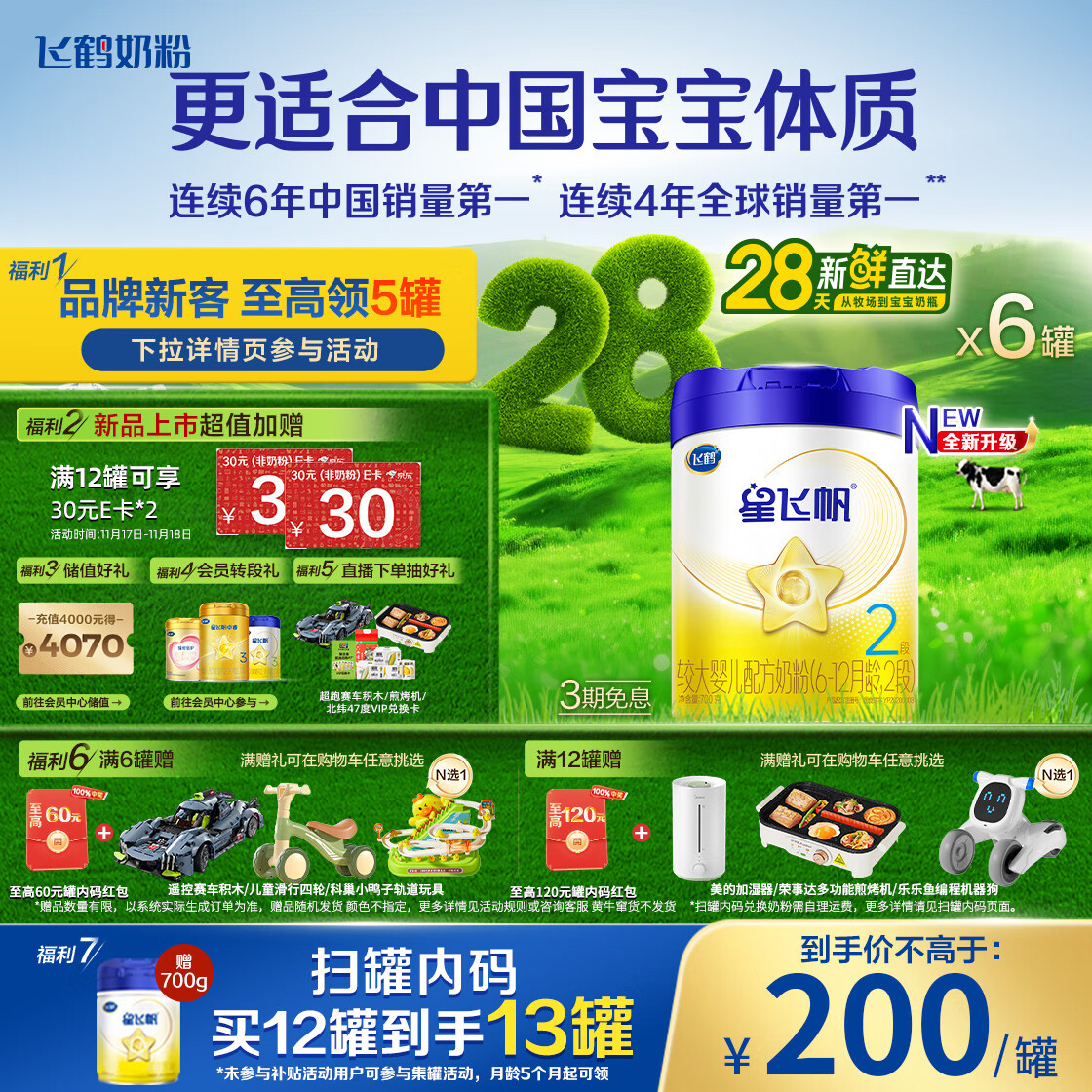 飞鹤星飞帆 婴幼儿奶粉2段(6-12个月) 700g*6【28天新鲜直达】 5HMOs