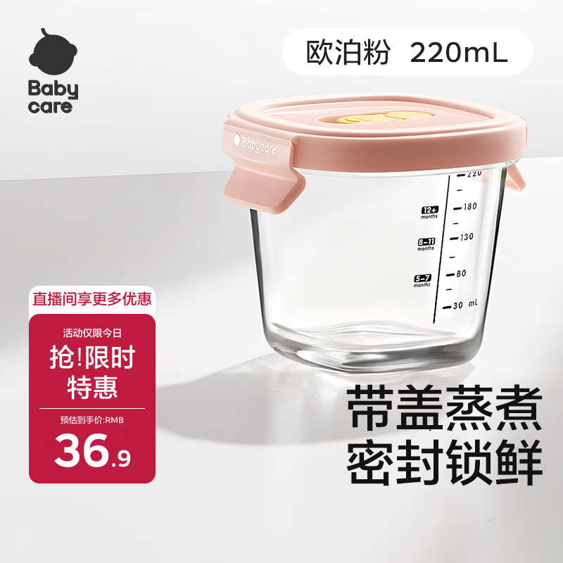 babycare婴儿辅食盒玻璃宝宝辅食保鲜工具便携防漏可蒸煮冷冻储存-粉220ml