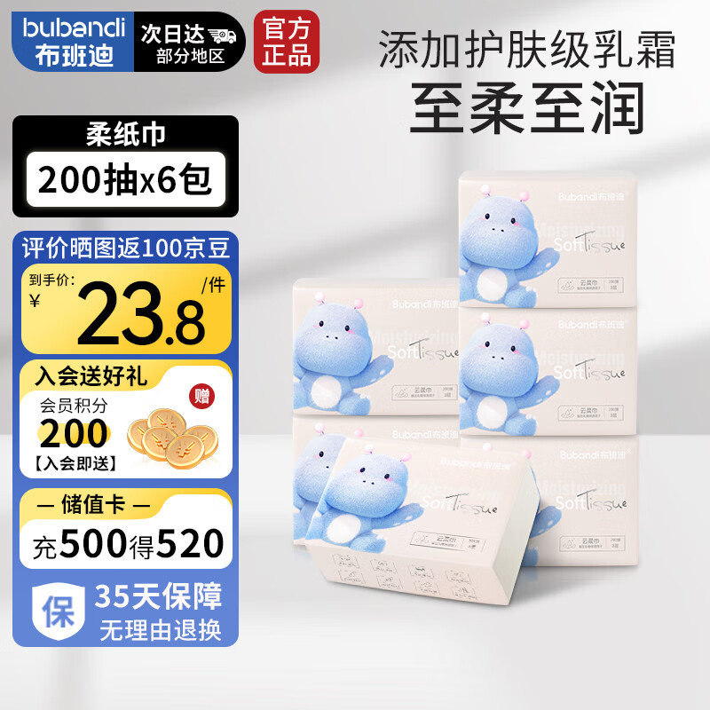 布班迪婴儿云柔巾乳霜纸3层200抽6包柔纸巾敏感肌肤适用抽纸亲肤柔润