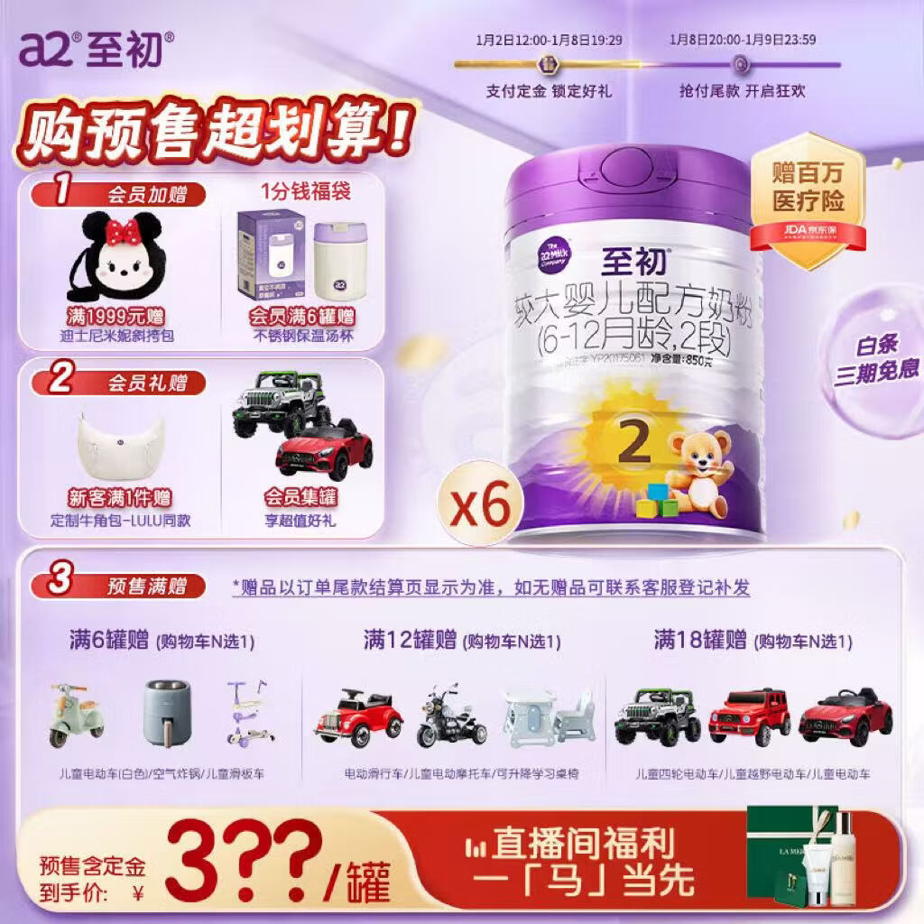 a2至初2段奶粉较大婴幼儿配方奶粉6-12月850g*6罐二段奶粉乳铁蛋白