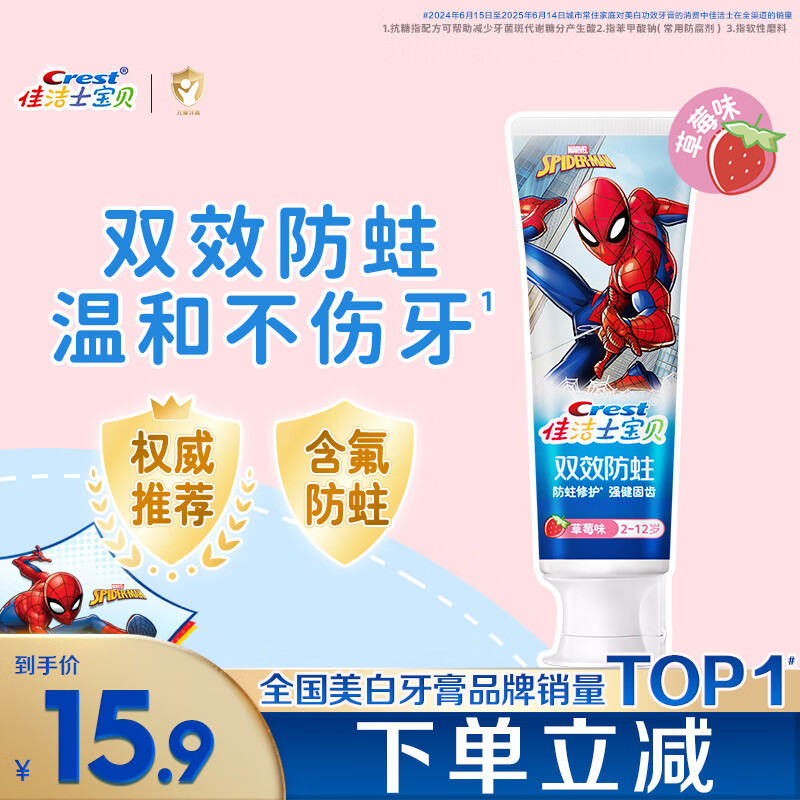 佳洁士防蛀固齿低氟2-3-6-12岁热销榜儿童牙膏蜘蛛侠草莓味90g京东自营