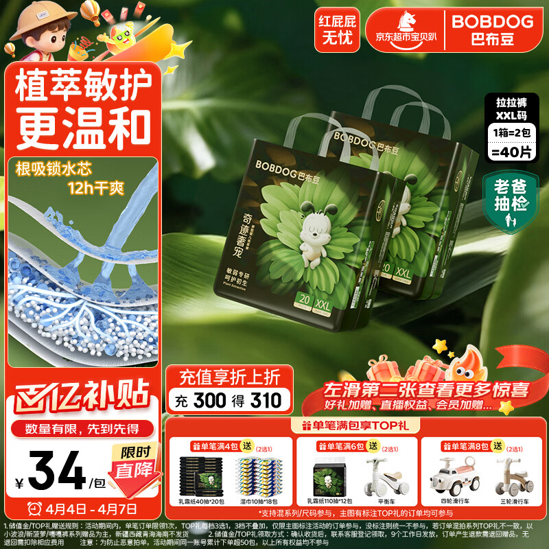 巴布豆(BOBDOG)奇迹奢宠婴儿拉拉裤XXL码40片(14-17kg) 夏季超薄透气尿不湿