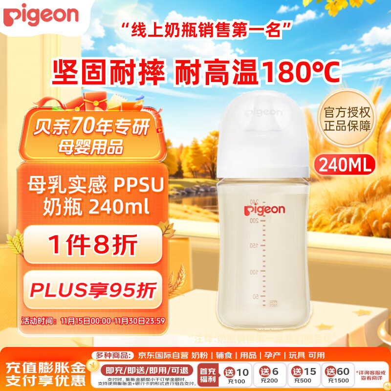 贝亲(Pigeon)婴儿新生儿奶瓶 防胀气奶瓶 PPSU第3代宽口径 自带奶嘴M号240ml