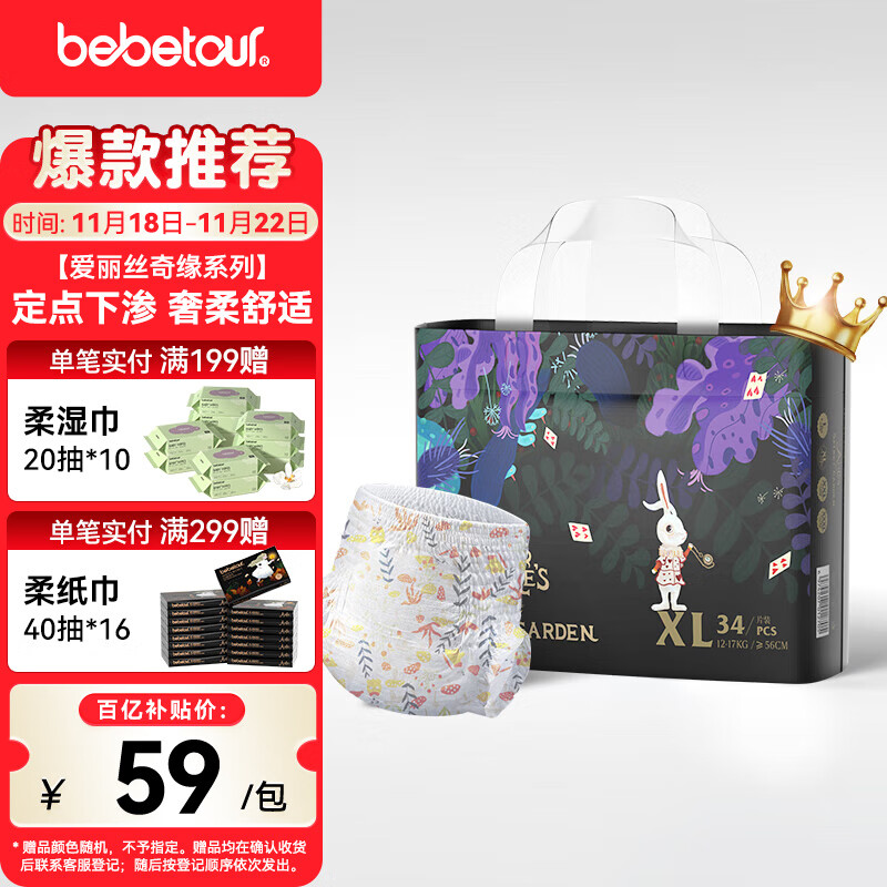 bebetour爱丽丝奇缘拉拉裤XL34片(12-17kg)定点下渗【品牌直供 安心品质】
