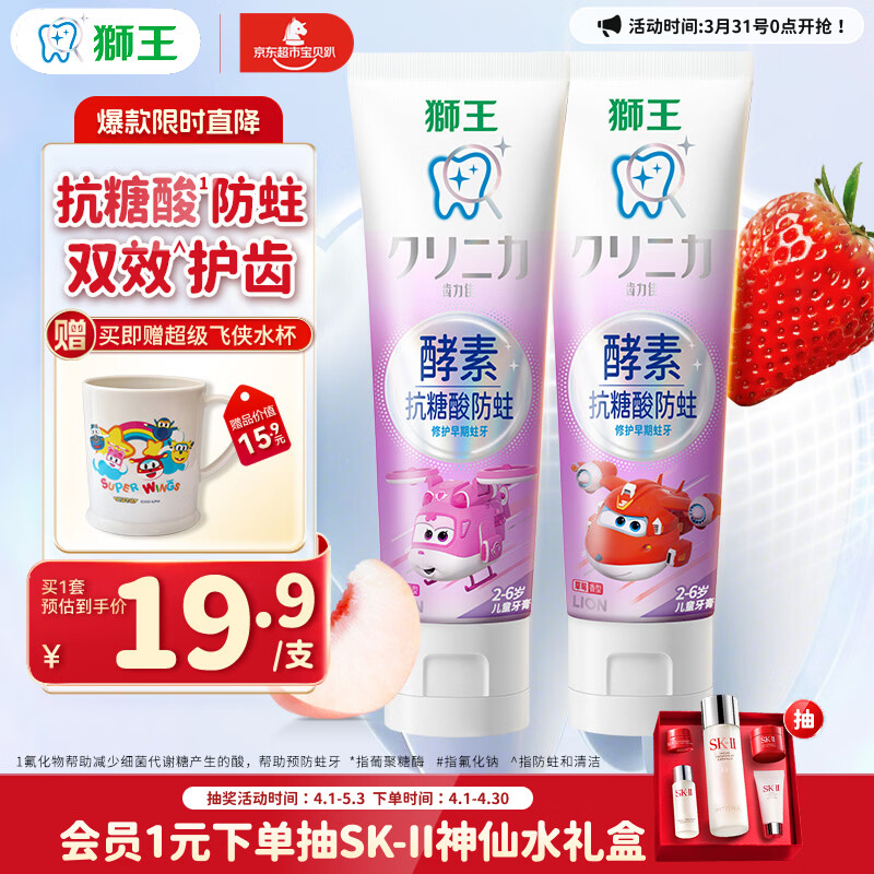 狮王(lion)齿力佳儿童酵素抗糖防酸蛀牙膏2-6岁2支120g草莓+蜜桃