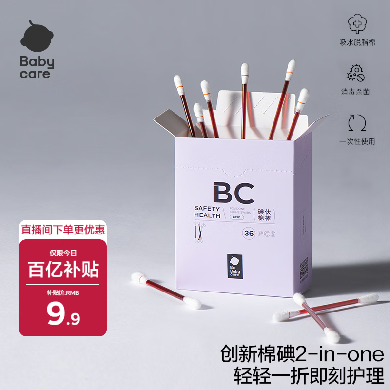 babycare婴儿棉签碘伏棉棒肚脐脐带棉签掏耳朵宝宝专用无菌棉棒 36支/盒