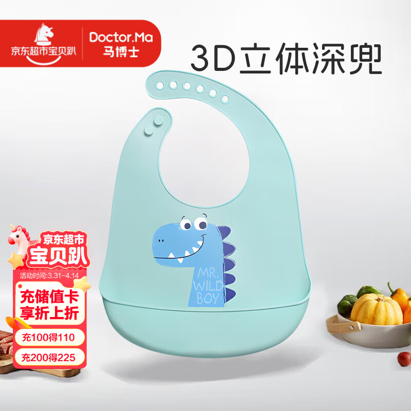 马博士 吃饭围兜婴儿硅胶围嘴宝宝饭兜儿童防水罩衣 蓝恐龙