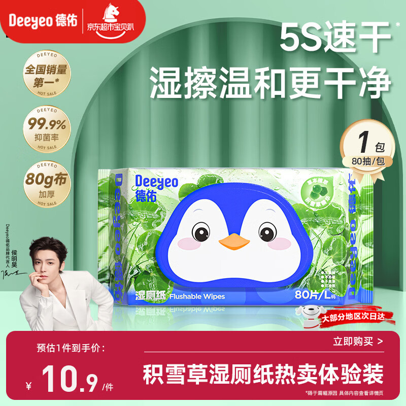 德佑积雪草湿厕纸80抽单包体验洁厕湿纸巾厕纸草本呵护擦屁屁柔厚升级