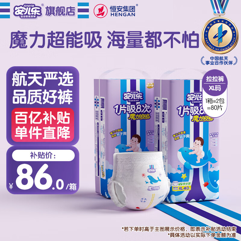 安儿乐(Anerle)魔力吸吸拉拉裤XL40片*2(12-17kg)透气大吸量尿不湿【夜用专研】