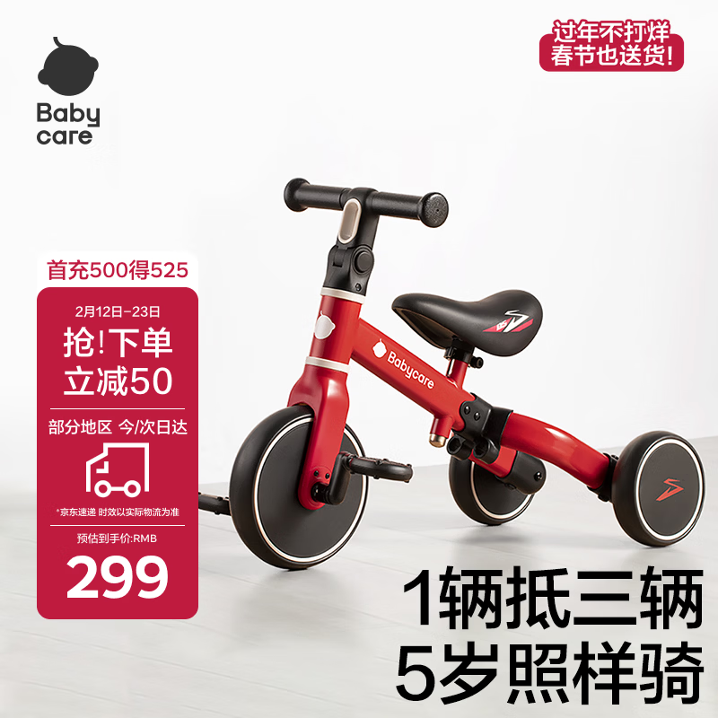 babycare儿童三轮车宝宝平衡脚踏车多功能二合一学步滑步车1-5岁 罗拉红