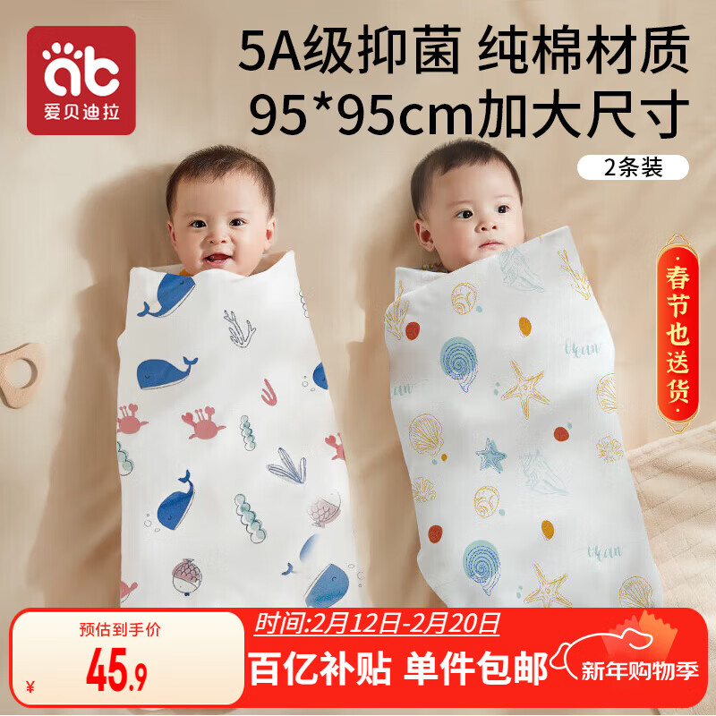 爱贝迪拉 新生婴儿包单产房纯棉襁褓裹布包巾包被四季抱被睡袋95cm单层2条