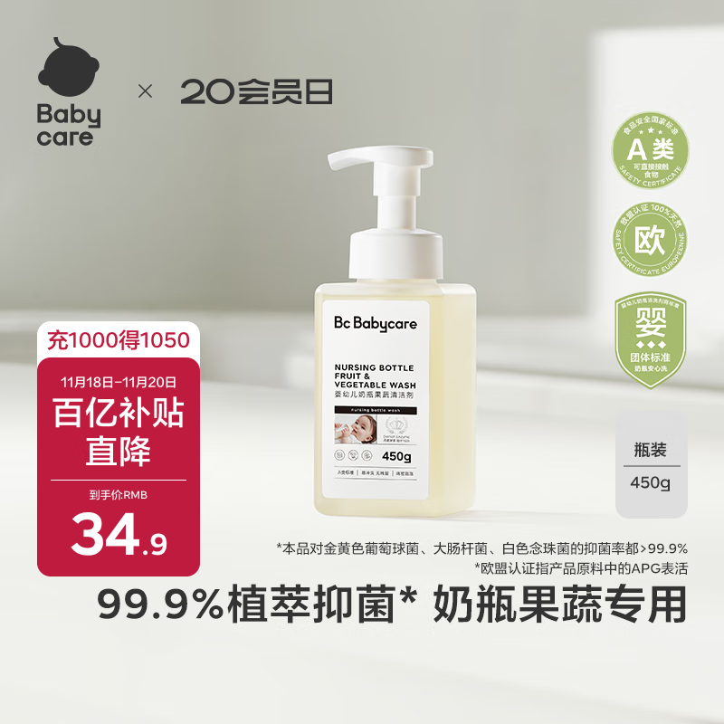 babycare奶瓶清洗剂奶嘴清洁婴儿餐具果蔬清洁剂谷物酵素清洗液 450g/瓶