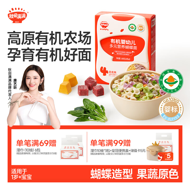 秋田满满有机蝴蝶面1-3岁宝宝面条160g婴儿辅食儿童早餐彩蝶面 100%真验厂