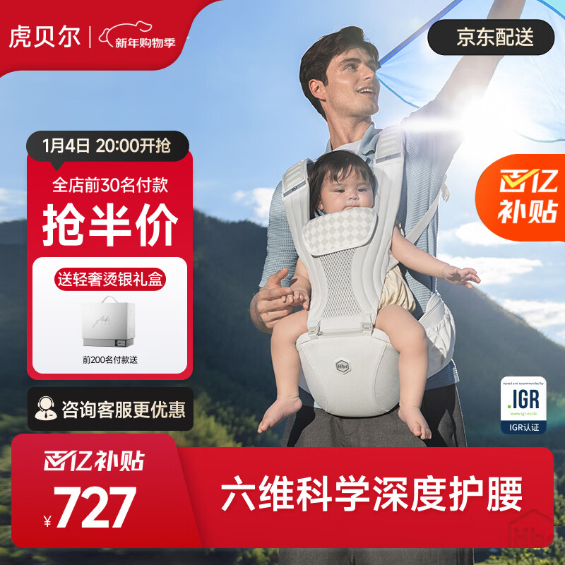虎贝尔(HBR)Air Max深度护腰六维婴儿腰凳背带二合一轻便四季抱娃神器 银雾白