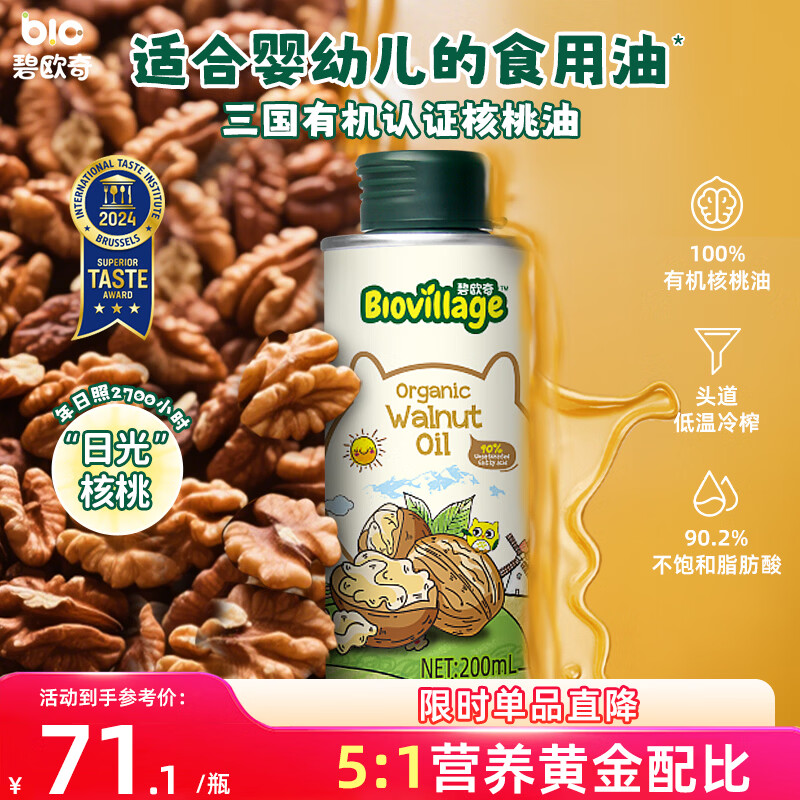 碧欧奇有机核桃油200ml 宝宝辅食用油 凉拌热炒6个月以上适合婴幼儿