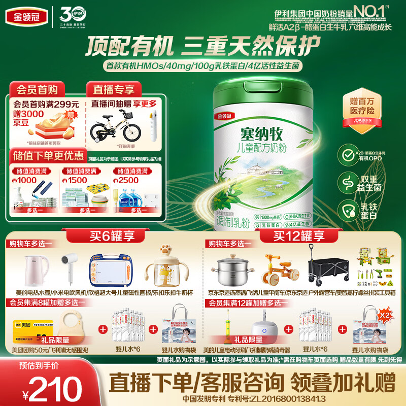 伊利金领冠塞纳牧有机A2β-酪蛋白奶粉4段(3-6岁)800g*1罐 首款HMO