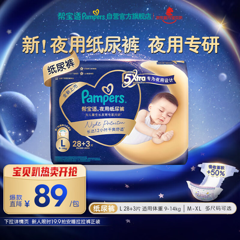 帮宝适夜用专研安睡纸尿裤婴儿尿不湿超薄透气防漏安睡一整夜L28+3