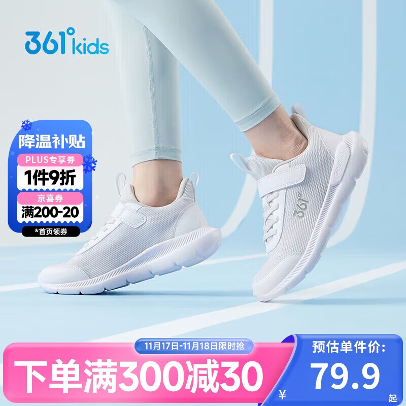 361°儿童运动鞋男女童(3-12岁)防撞鞋头密网休闲跑鞋 白 35