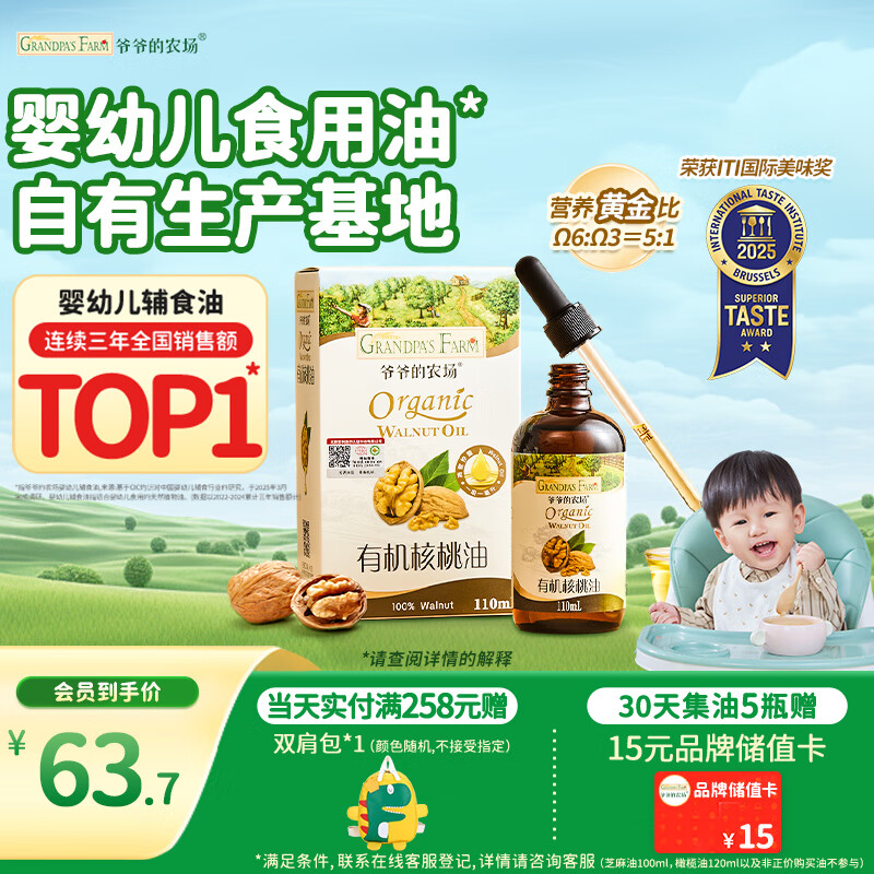 爷爷的农场有机核桃油110ml 凉拌热炒婴幼儿食用油 宝宝辅食油6个月以上