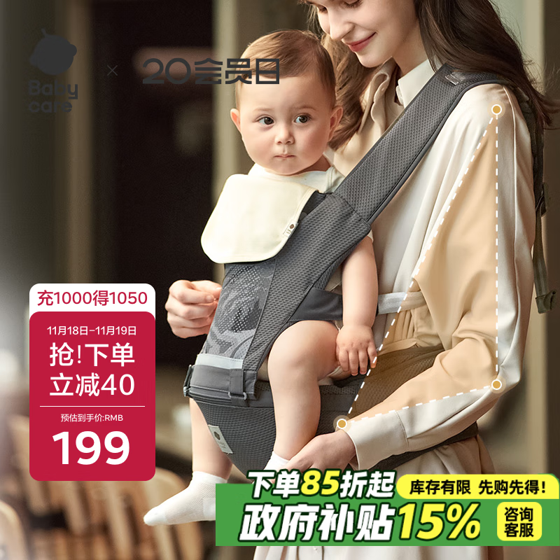 babycare腰凳婴儿背带多功能减震四季抱娃神器解放双手透气轻薄款卡斯尔灰