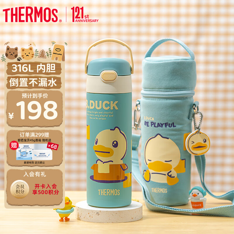膳魔师(THERMOS)保温杯儿童直饮水杯小学生开学必备小黄鸭水壶带杯套500ml淡绿