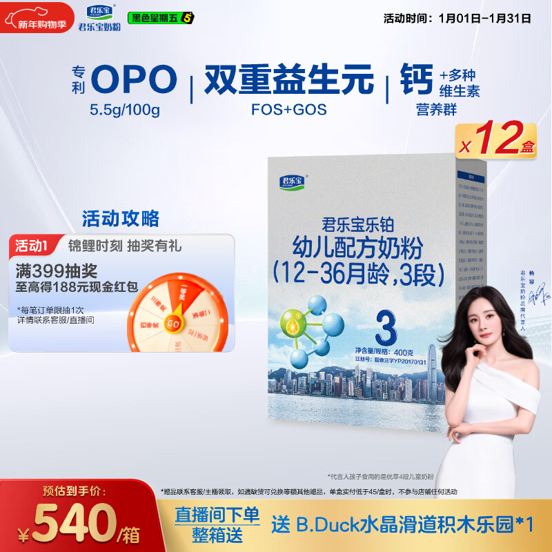 君乐宝(JUNLEBAO)奶粉乐铂幼儿配方奶粉(12-36个月龄,3段)400克*12盒 含OPO结构脂