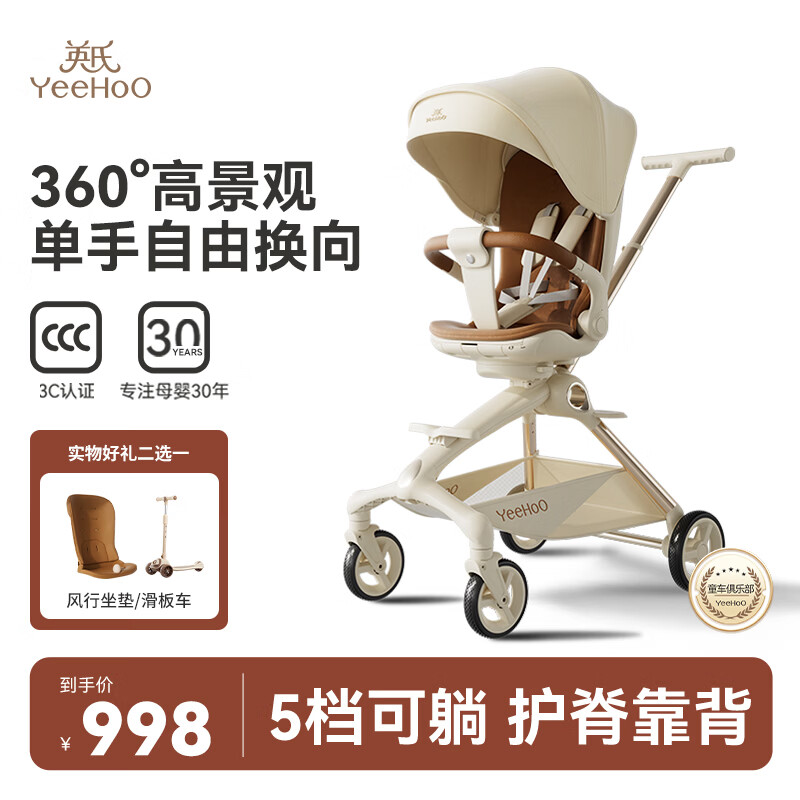 英氏(YEEHOO)风行遛娃神器 双向高景观婴儿车折叠可坐可躺轻便带减震 简咖色
