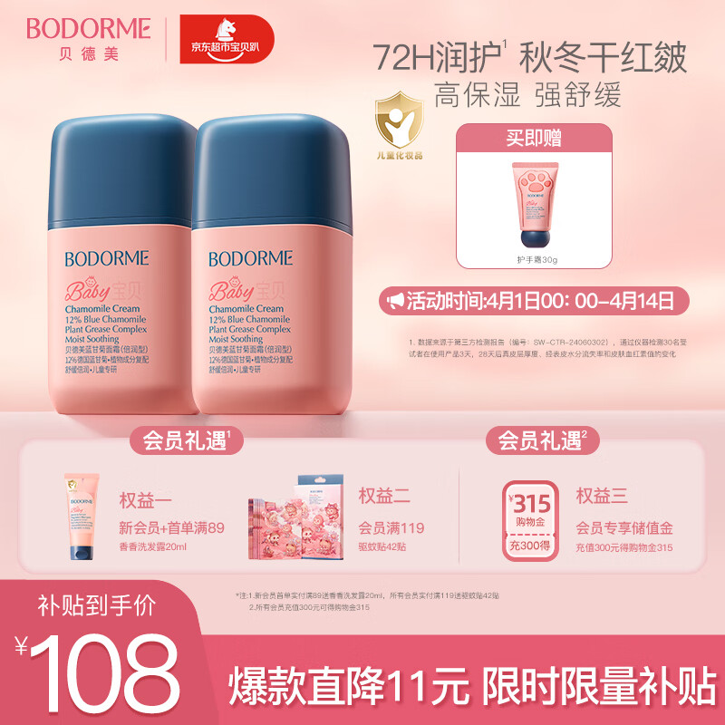 贝德美儿童蓝甘菊宝宝面霜滋润补水保湿婴儿 防皴擦脸霜50g【二瓶装】