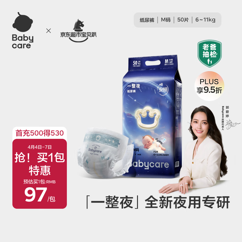 babycare一整夜纸尿裤M50片(6-11kg)大吸量透气夜用安睡婴儿尿不湿