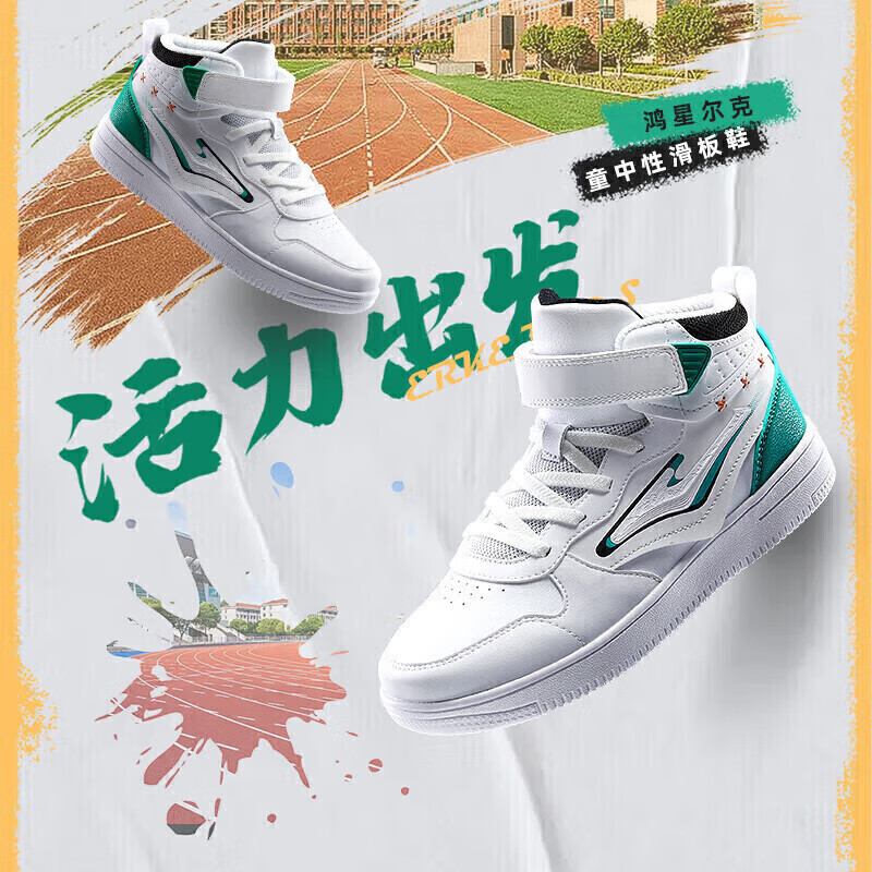 鸿星尔克(ERKE)童鞋童中性大童滑板鞋儿童高帮简约小白鞋尔克白/曙光绿32
