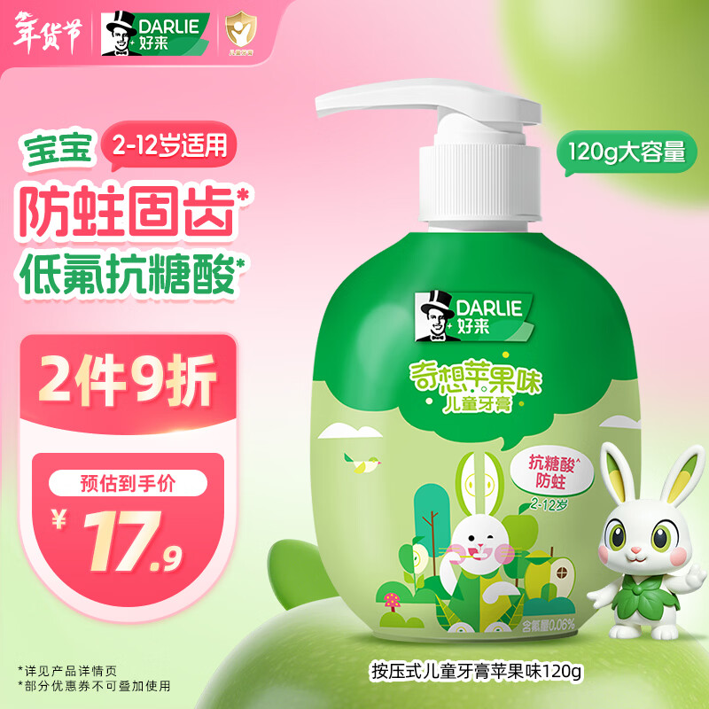 DARLIE好来(原黑人)按压式儿童牙膏2-3-6-12岁苹果味120g抗糖酸防蛀含氟