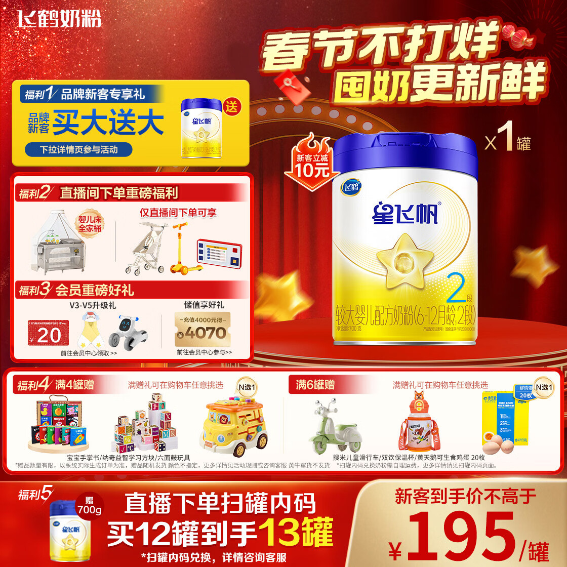 飞鹤星飞帆 婴幼儿配方奶粉2段(6-12月龄) 700g 专利OPO 育儿补贴
