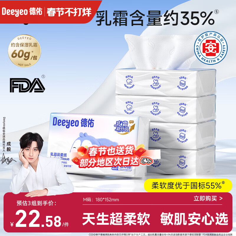 德佑云柔巾婴儿适用乳霜纸柔纸巾抽纸宝宝云柔巾120抽5包