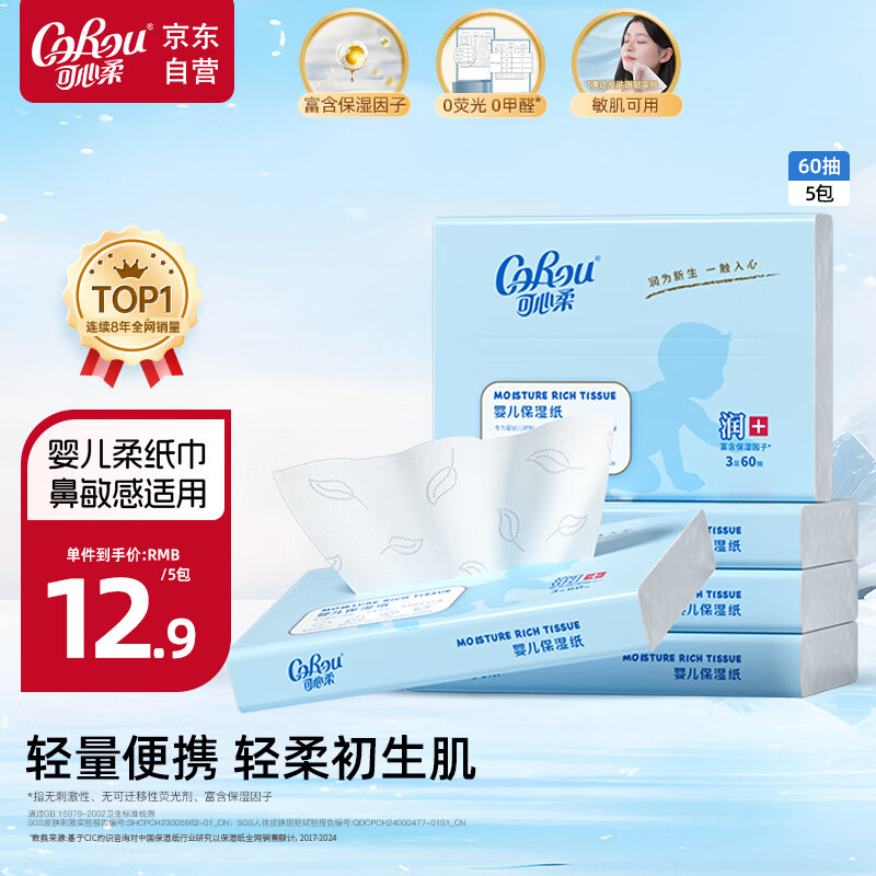 可心柔婴童乳霜纸3层60抽5包婴儿纸柔润保湿抽纸