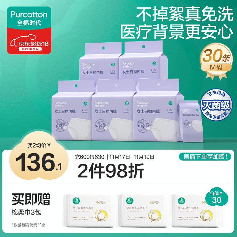 全棉时代一次性内裤女纯棉不掉絮灭菌 L码30条【品牌直供 安全灭菌】